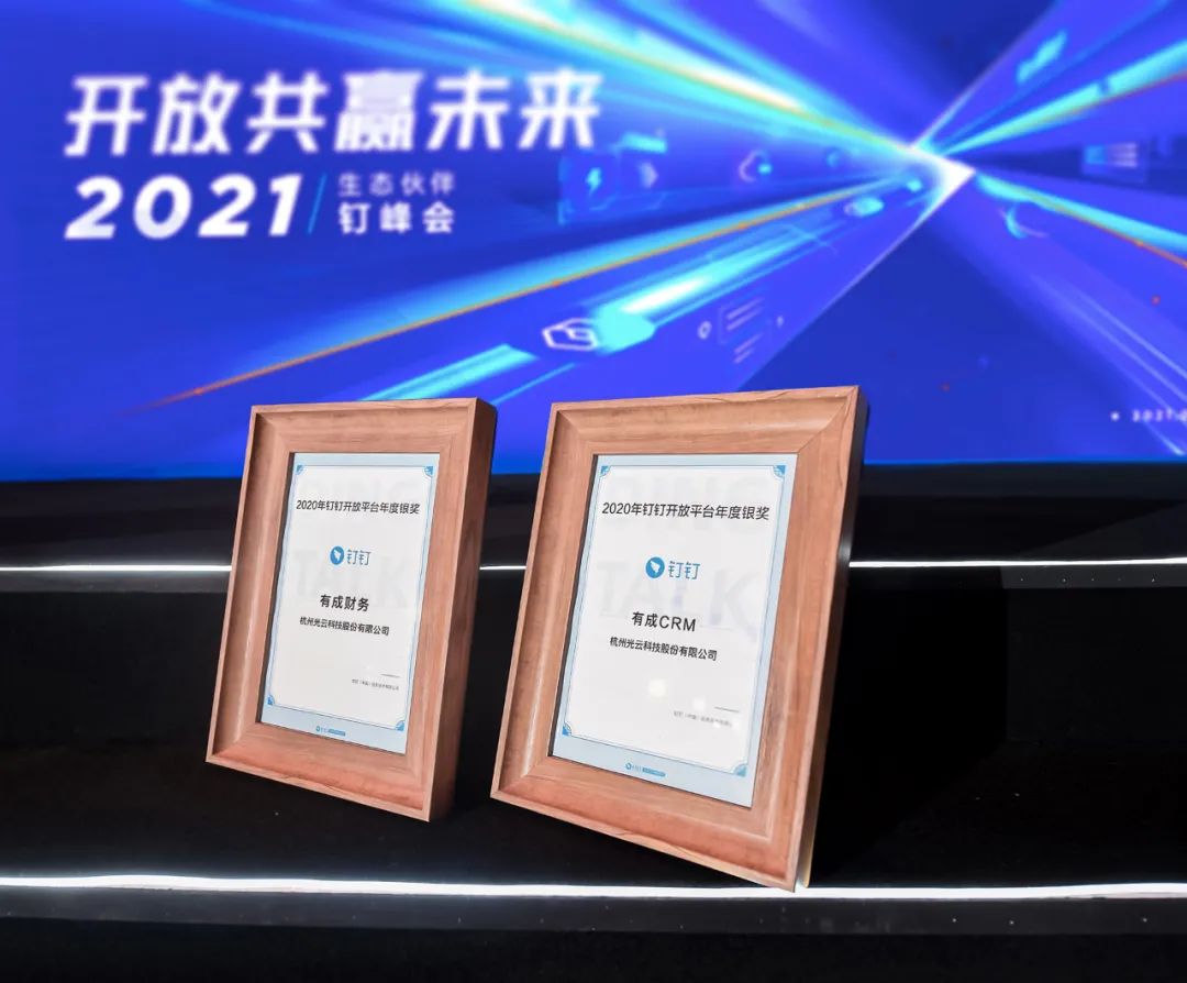 大会现场,光云科技旗下有成财务、有成CRM凭借优秀的业绩和专业的实力在一众同行中脱颖而出,斩获“2020年钉钉开放平台年度银奖”双重奖项。