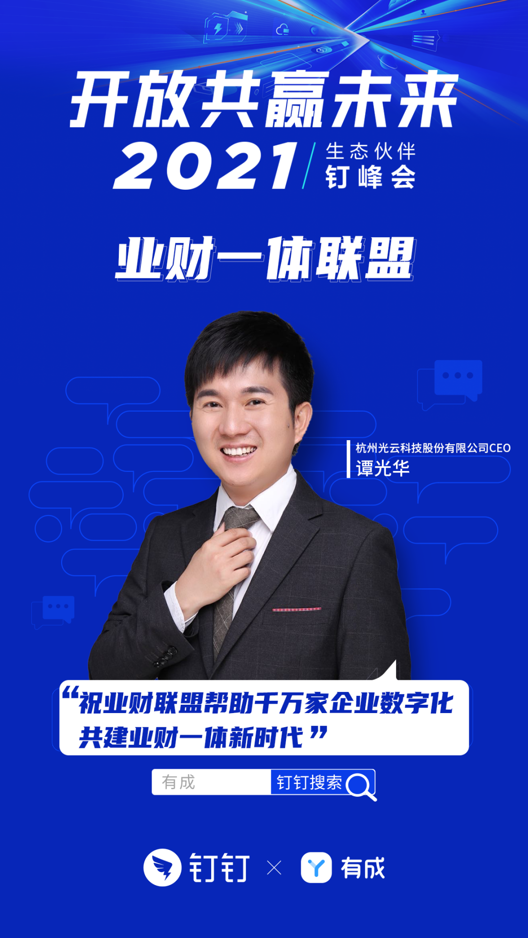 此次峰会的另一个重要议程——钉钉重磅发布了业财联盟,有成作为业财联盟的首批成员,高调亮相发布会现场,同时光云科技CEO谭光华先生也到现场,与联盟成员一起开启业财一体化新时代。